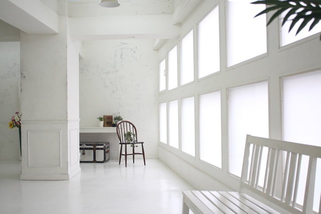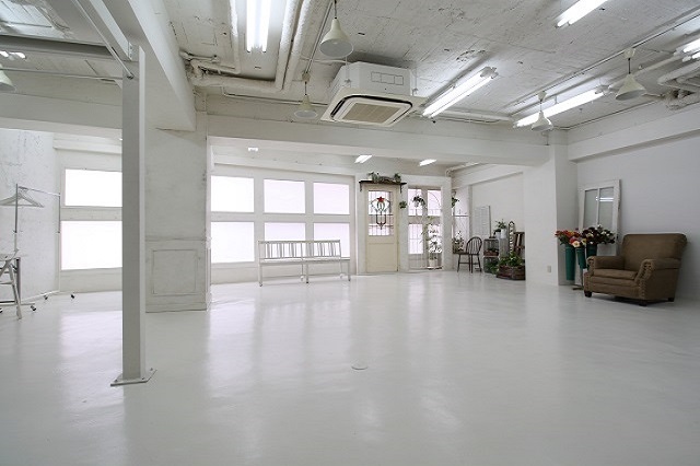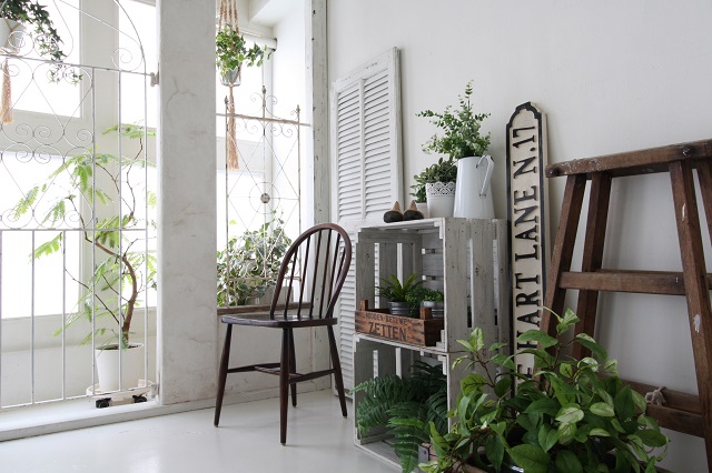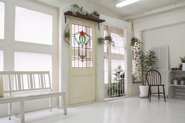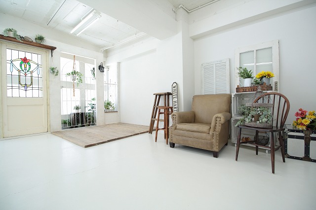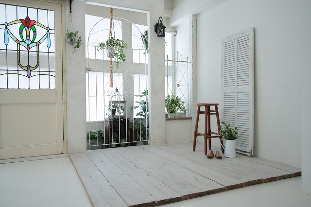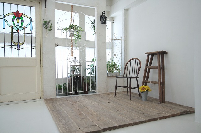 スタジオユニット最大面積(天井高:2.7M)で壁一面が窓でやわらかい自然光が魅力の明るいスタジオです。窓面の一角にアンティークドア、ガーデンフェンス等アンティーク雑貨をレイアウト。